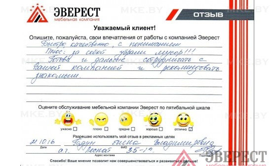 Хочу также отметить, что все было сделано в установленный срок, отдельное спасибо установщикам. все делалось профессионально и качественно. Большое спасибо за кухню!!! Всем рекомендую!